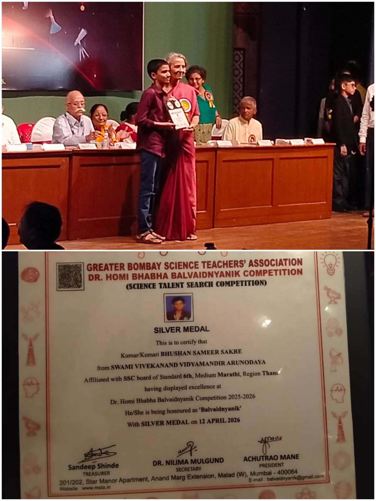 प्रतिष्ठेच्या डॉ. होमी भाभा बालवैज्ञानिक स्पर्धा परीक्षेत इयत्ता सहावीतील कुमार भूषण समीर सक्रे याने आपल्या विलक्षण वैज्ञानिक प्रतिभेचा परिचय देत सिल्वर मेडल व सन्मानपत्र पटकावले आहे. ही कामगिरी म्हणजे शालेय जीवनातील विज्ञानप्रेम, जिज्ञासा आणि संशोधन वृत्तीचा तेजस्वी विजयकळस ठरली आहे. या यशाने शाळेच्या शिरपेचात मानाचा तुरा रोवला असून विज्ञानाच्या क्षेत्रात विद्यार्थ्यांच्या उज्ज्वल भविष्यासाठी प्रेरणेचा दीप प्रज्वलित केला आहे.