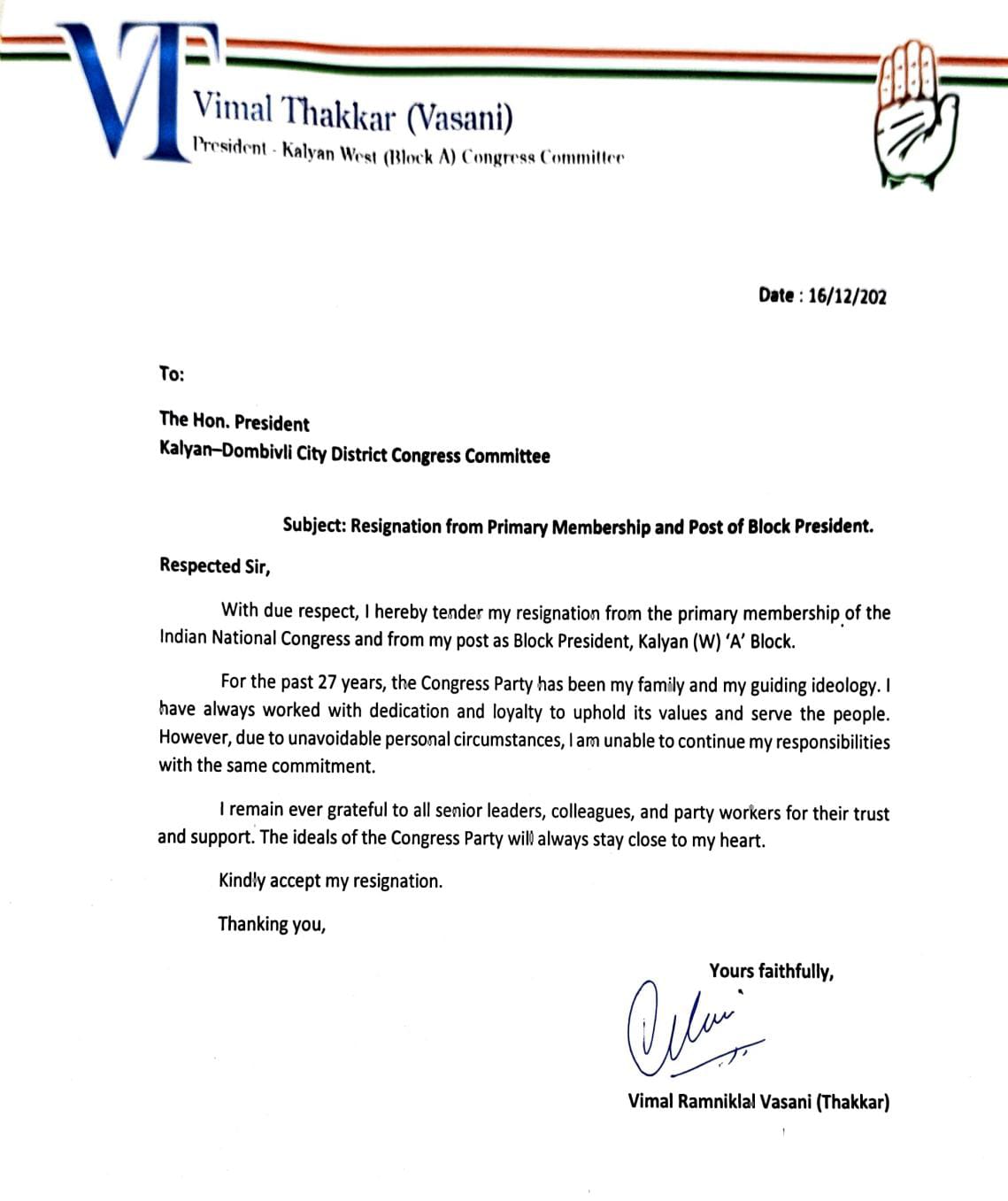 काँग्रेस पक्ष आणि पक्ष नेतृत्वाबाबत आमच्या मनात कोणतीही नाराजी नाही. पक्षाचे ज्येष्ठ नेते संजय दत्त हे आमच्यासाठी गुरुस्थानी असून, त्यांच्या मार्गदर्शनाखाली राजकारणातील अनेक पैलू शिकण्याची संधी मिळाली. गेली तब्बल २७ वर्षे काँग्रेसच्या विद्यार्थी संघटनेच्या माध्यमातून सामाजिक कार्याची सुरुवात करत आम्ही काँग्रेस पक्षात प्रामाणिकपणे काम केले आहे. त्यामुळे काँग्रेस पक्षातून बाहेर पडण्याचा निर्णय हा अत्यंत जड अंतःकरणाने घ्यावा लागत असल्याची प्रतिक्रिया ठक्कर यांनी यावेळी व्यक्त केली.