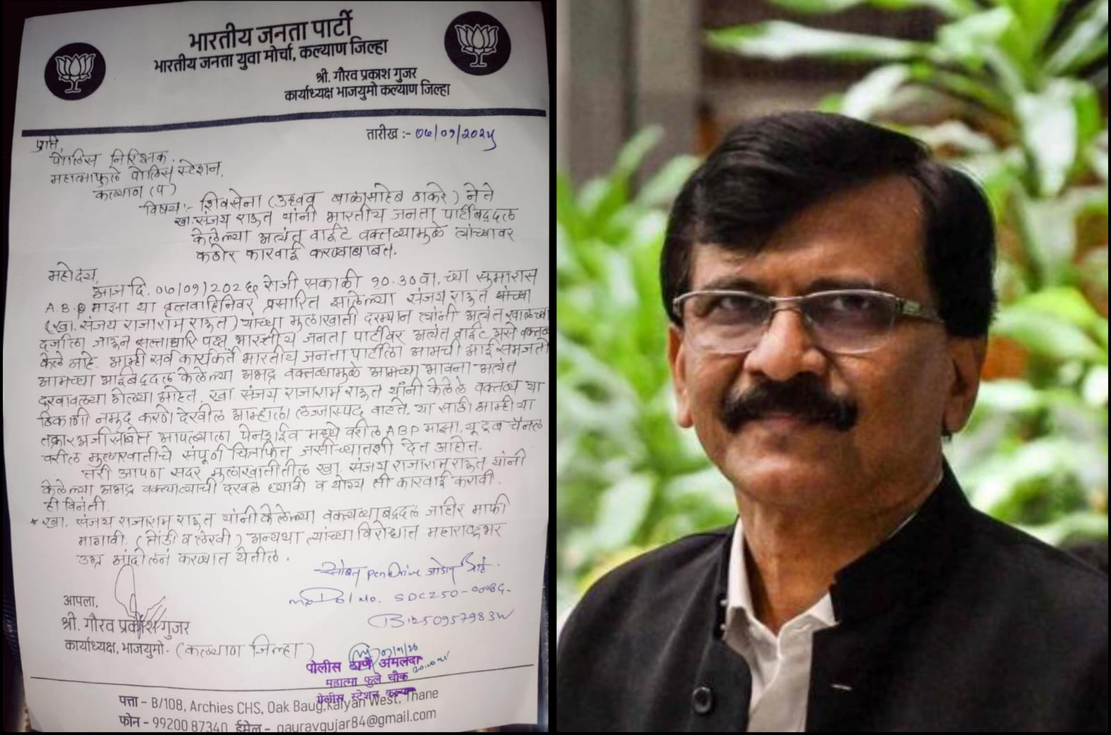 शिवसेना उद्धव बाळासाहेब ठाकरे पक्षाचे खासदार संजय राऊत यांनी भारतीय जनता पक्षाबाबत केलेल्या ‘त्या’ वक्तव्याविरोधात कल्याण जिल्हा भारतीय जनता युवा मोर्चाच्या पदाधिकाऱ्यांनी महात्मा फुले पोलीस ठाण्यात निवेदन देत करत कारवाईची मागणी केली आहे. तसेच संजय राऊत यांनी जाहीर माफी न मागितल्यास उग्र आंदोलन करण्याचा इशारा कल्याण जिल्हा भाजयुमोतर्फे देण्यात आला आहे. (BJYM demands action against Sanjay Raut over remarks on BJP; memorandum submitted in Kalyan)