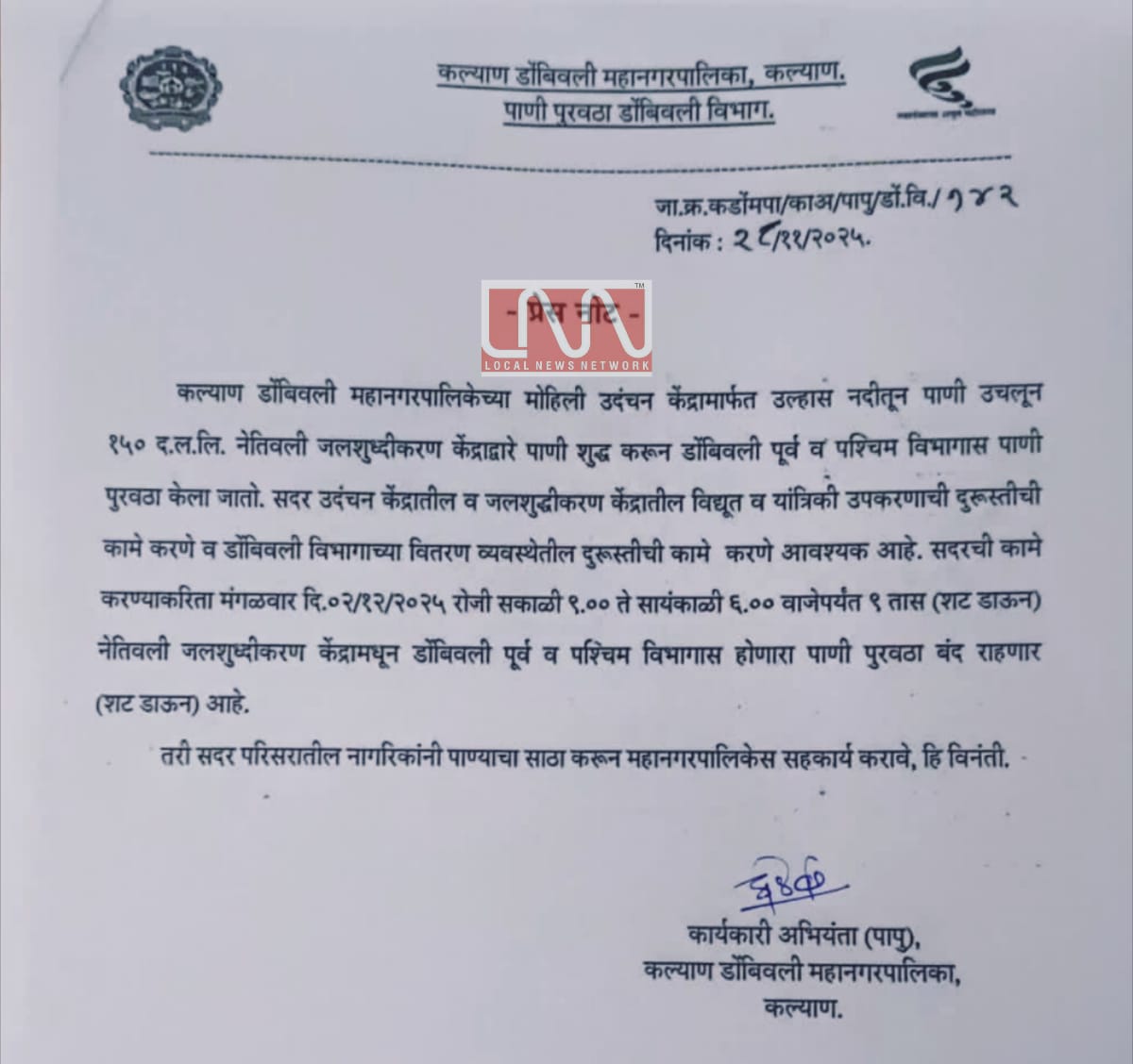 या दुरुस्ती कामांसाठी मंगळवारी २ डिसेंबर २०२५ रोजी सकाळी ९ ते सायंकाळी ६ वाजेपर्यंत नऊ तास (शट डाऊन) नेतिवली जलशुध्दीकरण केंद्रामधून डोंबिवली पूर्व आणि पश्चिम विभागास होणारा पाणी पुरवठा बंद राहणार (शट डाऊन) आहे.