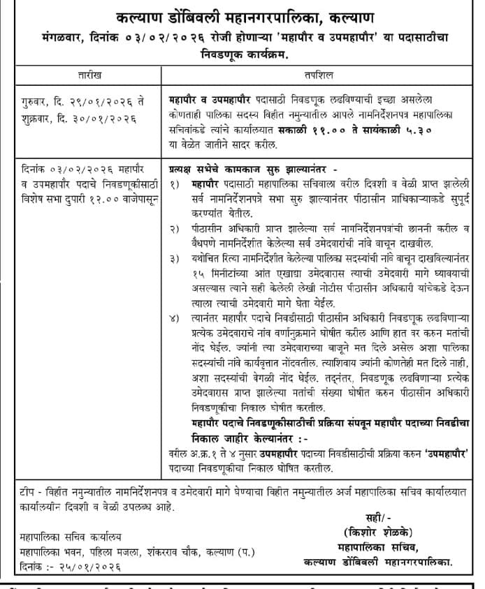 2) मंगळवारी 3 फेब्रुवारी 2026 रोजी दुपारी 12 वाजल्यापासून महापौर – उपमहापौर निवडीची विशेष सर्वसाधारण सभेचे आयोजन…