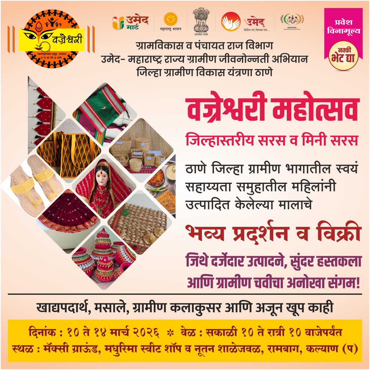 ठाणे जिल्ह्यातील ग्रामीण भागातील महिलांच्या कलागुणांना वाव देण्यासाठी आणि त्यांच्या हाताला हक्काची बाजारपेठ मिळवून देण्यासाठी “वज्रेश्वरी महोत्सव: जिल्हास्तरीय सरस व मिनी सरस” प्रदर्शनाचे आयोजन करण्यात आले आहे. ग्रामविकास आणि पंचायत राज विभाग आणि ‘उमेद’ महाराष्ट्र राज्य ग्रामीण जीवनोन्नती अभियानांतर्गत जिल्हा ग्रामीण विकास यंत्रणा ठाणे यांच्या वतीने या भव्य महोत्सवाचे नियोजन करण्यात आले असून, यात ग्रामीण संस्कृती आणि आधुनिकतेचा सुंदर मिलाफ पाहायला मिळणार आहे.