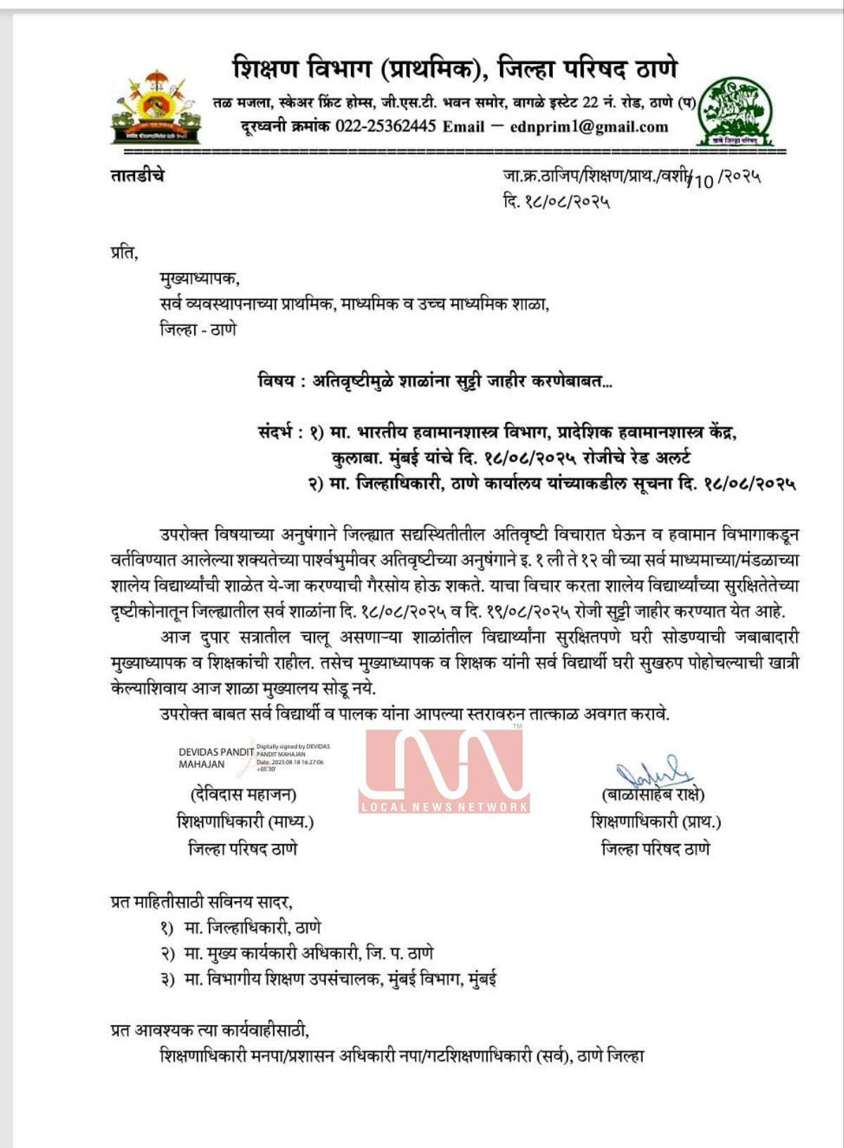 हवामान विभागाने दिलेल्या अतिवृष्टीच्या इशाऱ्यामुळे ठाणे जिल्ह्यातील प्राथमिक, माध्यमिक आणि उच्च माध्यमिक (1 ली ते 12वी पर्यंत) शाळांना जिल्हा परिषद शिक्षण विभागाने सुट्टी जाहीर केली आहे. ठाणे जिल्हा परिषदेच्या शिक्षण विभागाकडून याबाबतचा निर्णय घेण्यात आला आहे. (Heavy rain warning: Holiday declared for schools in Thane district tomorrow, August 19, 2025)