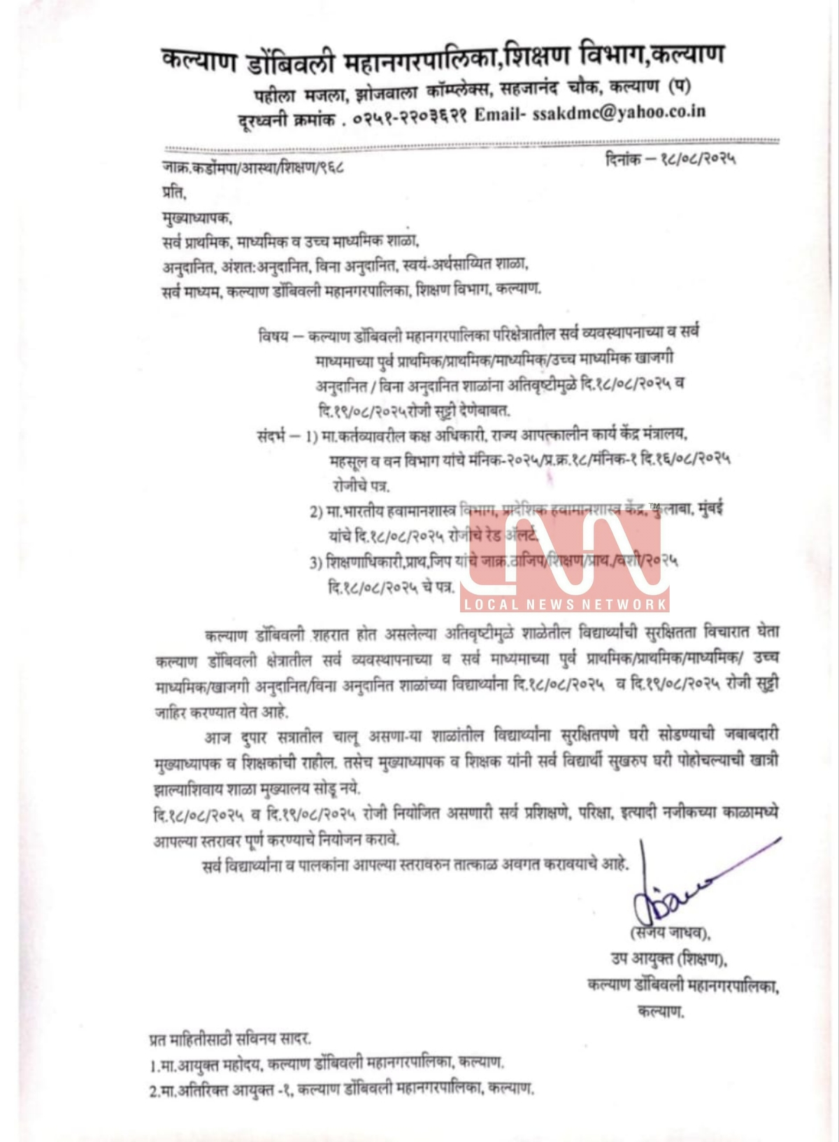 या पार्श्वभूमीवर कल्याण डोंबिवली महापालिका क्षेत्रातील सर्व माध्यमाच्या पूर्व प्राथमिक, प्राथमिक, माध्यमिक आणि उच्च माध्यमिक शाळांना उद्या मंगळवार 19 ऑगस्ट 2025 रोजी सुट्टी जाहीर करण्यात आली आहे.