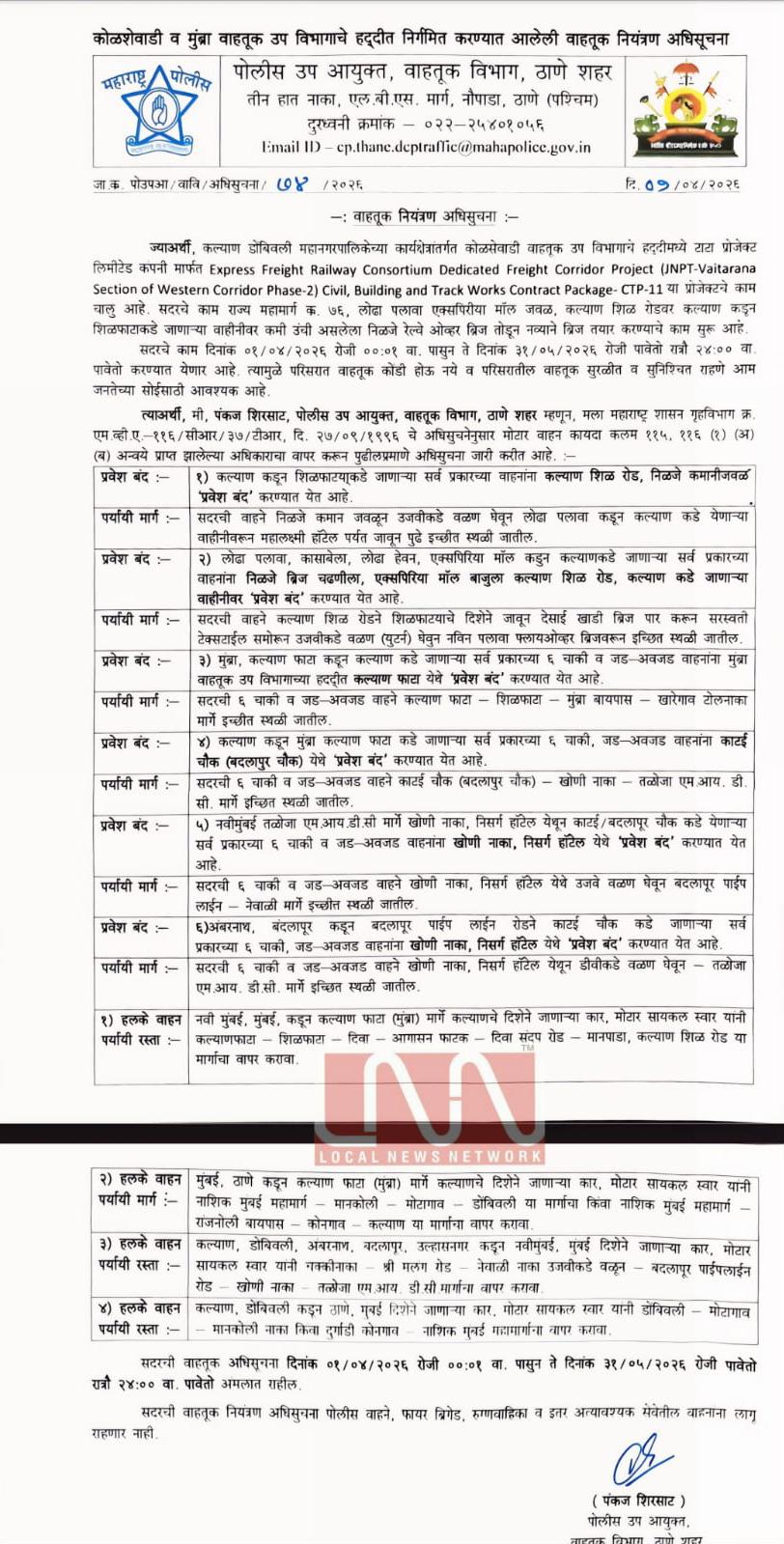डेडिकेटेड फ्रेट कॉरिडॉरच्या कामांतर्गत कल्याण – शिळफाटा मार्गावरील जुना निळजे रेल्वे उड्डाणपूल (कल्याणहून शिळफाट्याकडे जाणाऱ्या मार्गावर) तोडून नवा बांधण्याचे काम सुरू आहे. आजपासून म्हणजेच 1 एप्रिलच्या रात्री 12 वाजल्यापासून ते 31 मे 2026 पर्यंत हे काम केले जाणार असल्याने या मार्गावर पुढीलप्रमाणे मोठे वाहतूक बदल करण्यात आले आहेत.