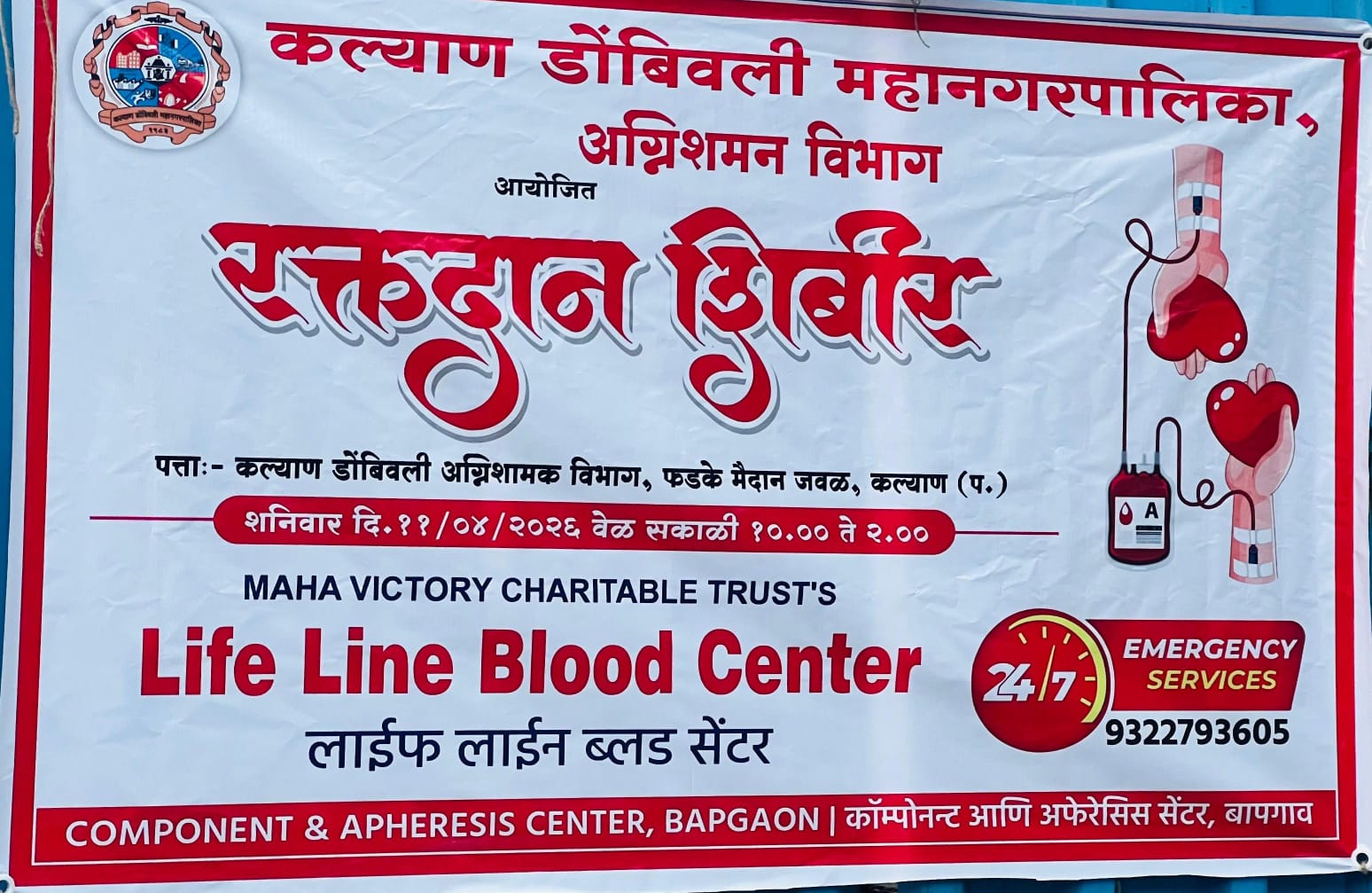 हे रक्तदान शिबिर येत्या शनिवार दिनांक ११ एप्रिल २०२६ रोजी सकाळी १०.०० ते दुपारी २.०० या वेळेत कल्याण (प.) येथील फडके मैदानाजवळील, अग्निशामक विभाग येथे आयोजित करण्यात आले आहे. या शिबिराचे आयोजन ‘महा व्हिक्टरी चॅरिटेबल ट्रस्ट’च्या ‘लाईफ लाईन ब्लड सेंटर’च्या सहकार्याने करण्यात आले आहे.