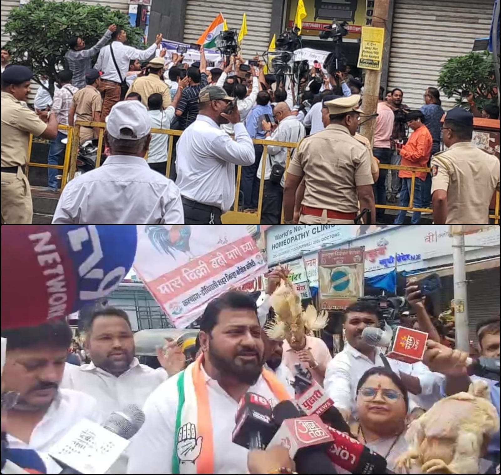 दरम्यान सुरुवातीला खाटिक समाजाच्या सदस्य आणि पदाधिकाऱ्यांनी अचानक केडीएमसी मुख्यालयाबाहेर धडक देत निदर्शने केली. हातामध्ये कोंबड्या घेत त्यांनी केडीएमसीच्या या निर्णयाचा विरोध केला. या सर्व आंदोलकांना बाजारपेठ पोलिसांनी ताब्यात घेतले. तर त्यांच्यापाठोपाठ कल्याण जिल्हा काँग्रेसचे जिल्हाध्यक्ष सचिन पोटे यांच्या नेतृत्वाखाली छत्रपती शिवाजी महाराज चौकातून केडीएमसीकडे येणाऱ्या मार्गावर आंदोलन केले. काँग्रेस कार्यकर्त्यांनीही हातामध्ये कोंबड्या घेऊन केडीएमसीच्या निर्णयाविरोधात जोरदार घोषणाबाजी केली. तर हा निर्णय म्हणजे लोकशाहीची गळचेपी असून आम्ही आमच्या स्वातंत्र्यावरील येणारी बंधने अजिबात सहन करणार नाही अशी प्रतिक्रिया यावेळी सचिन पोटे यांनी दिली.