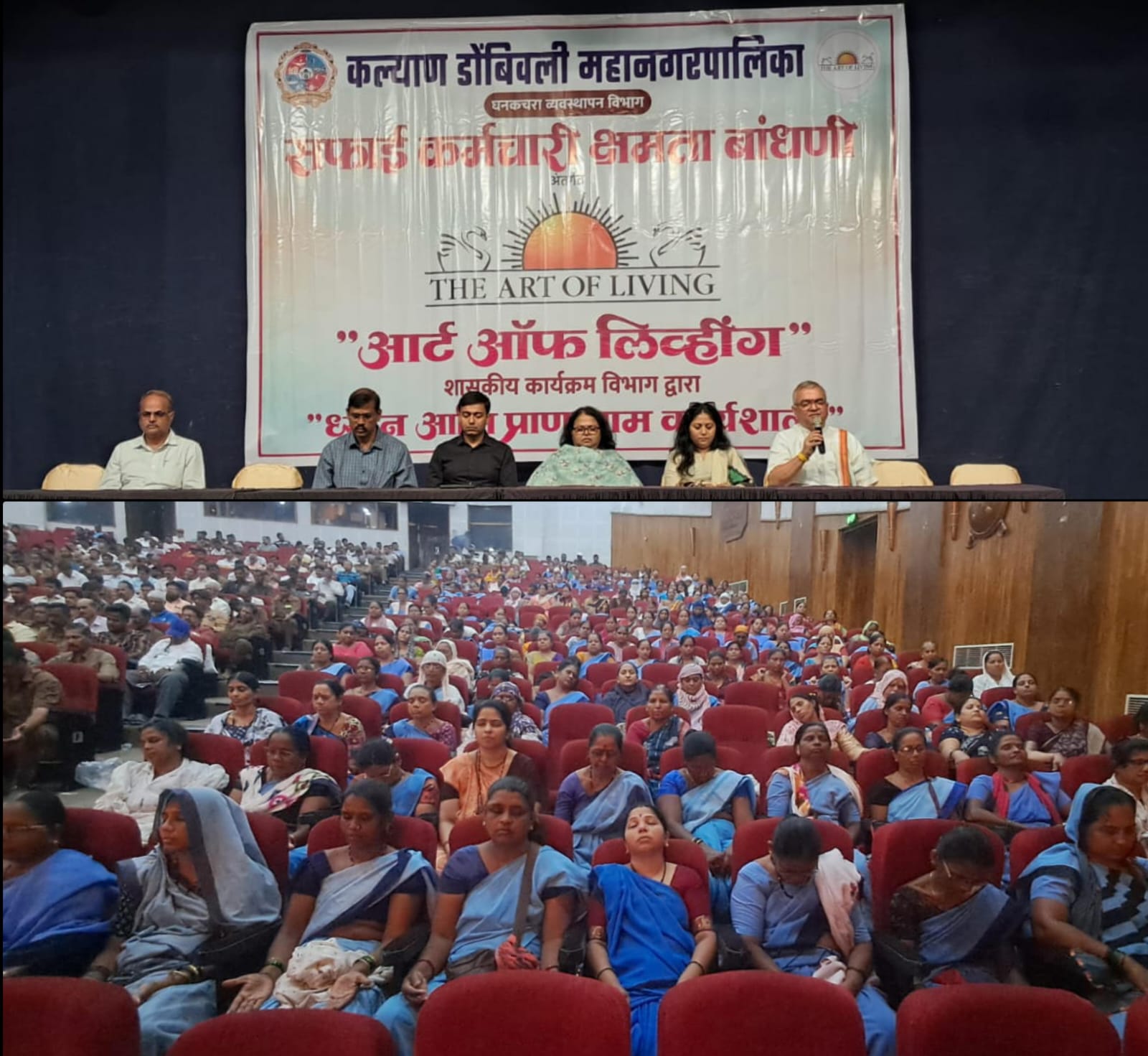 “निरोगी शरीर आणि शांत मन हीच खरी संपत्ती” या विचाराला केंद्रस्थानी ठेवत कल्याण डोंबिवली महानगरपालिका (KDMC) च्या घनकचरा विभागामार्फत आयोजित करण्यात आलेल्या सफाई कर्मचाऱ्यांसाठीच्या विशेष ध्यान-प्राणायाम कार्यशाळेचा आज यशस्वी समारोप झाला. महापालिका आयुक्त अभिनव गोयल यांच्या संकल्पनेतून आणि आर्ट ऑफ लिव्हिंग संस्थेच्या शासकीय कार्यक्रम विभागाच्या सहकार्याने हा उपक्रम राबविण्यात आला होता. (KDMC’s Noble Initiative Receives Overwhelming Response; ‘Art of Living’ Workshop for Sanitation Workers a Big Success)