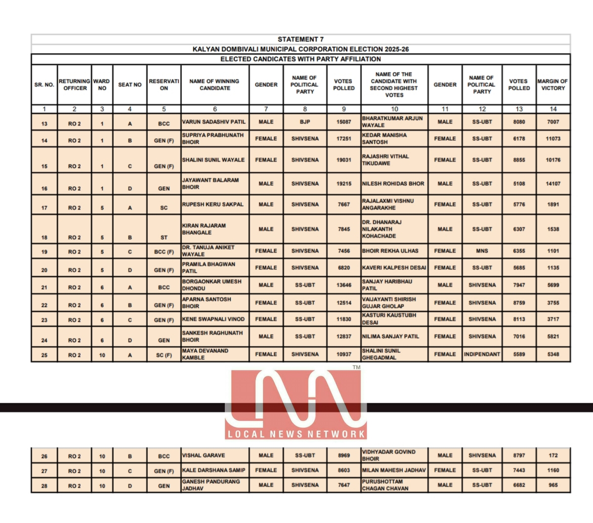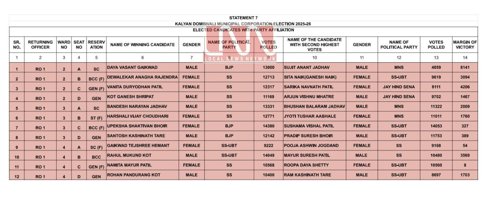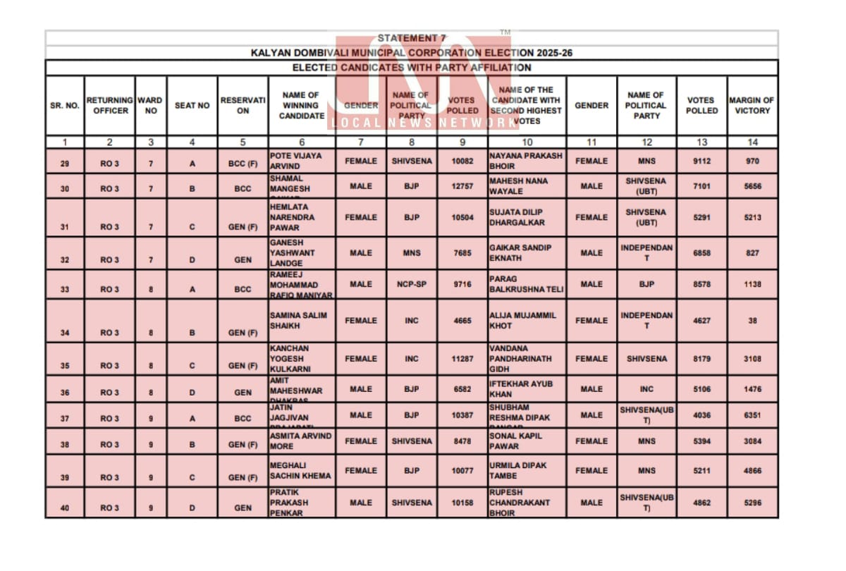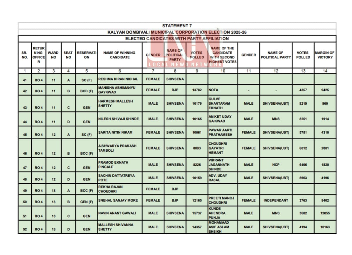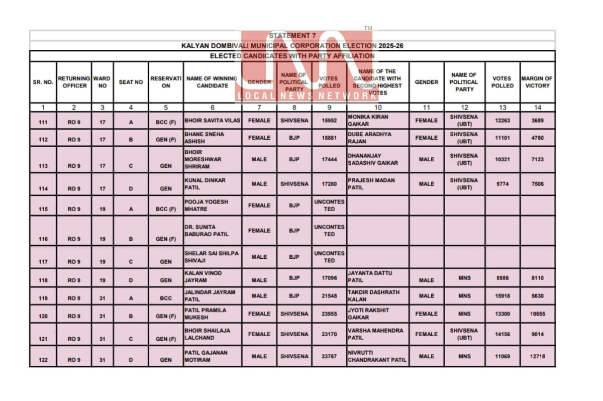 केडीएमसी निवडणुकीतील मतमोजणीमध्ये विजयी झालेल्या उमेदवारांची अधिकृत यादी