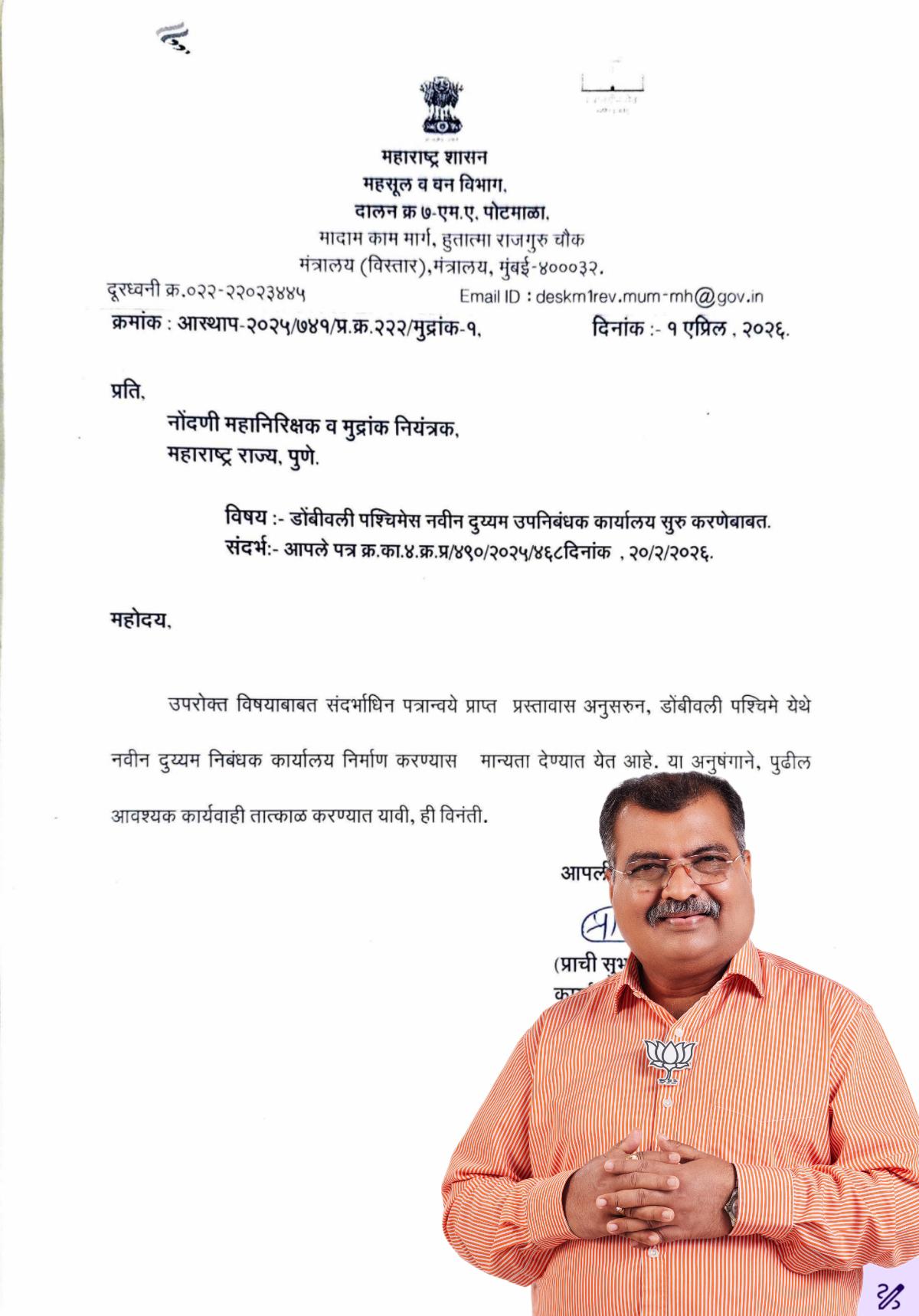 नागरिकांची अनेक वर्षांची मागणी होती, त्याबाबत अलीकडे महसूल विभाग आणि शासनाला पत्रव्यवहार करून पाठपुरावा केला. त्यानुसार मागणीला यश आले असून लवकरच पश्चिमेलाही दुय्यम निबंधक कार्यालय सुरू होईल.
