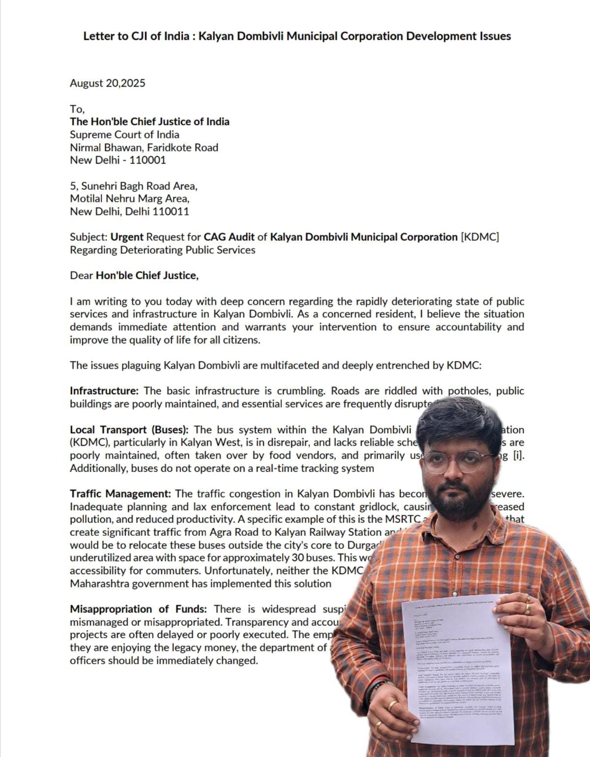 कल्याण-डोंबिवली महानगरपालिका (KDMC) क्षेत्रातील गंभीर नागरी समस्यांनी पिचलेल्या कल्याणातील एका जागरूक नागरिकाने थेट देशाच्या सर्वोच्च न्यायालयाच्या मुख्य न्यायाधीश भूषण गवई यांना पत्र लिहिले असून इथल्या नागरी समस्यांची कॅग CAG द्वारे चौकशी करण्याची मागणी केली आहे. निशित शहा असे या नागरिकाचे नाव असून त्यांनी शुक्रवारी पोस्टाद्वारे हे पत्र पाठवून केडीएमसीच्या कामकाजाची नियंत्रक आणि महालेखापरीक्षक (CAG) कमिटीमार्फत स्वतंत्र ऑडिट करण्याची मागणी केली आहे. (Serious civic issue, CAG should investigate the functioning of KDMC – citizen of the kalyan demand directly to the Chief Justice of the india)