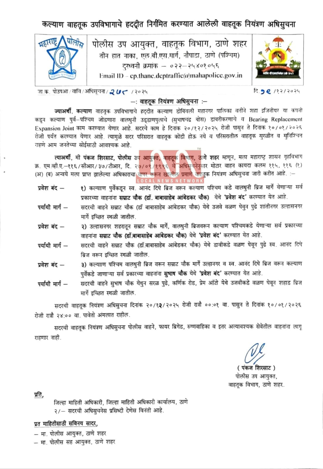 ही वाहतूक नियंत्रण अधिसुचना दिनांक २० जानेवारी रोजी रात्री 12 वाजल्यापासून ते दिनांक १० जानेवारी २०२६ पर्यंत रात्रौ 12 वाजेपर्यंत अंमलात राहणार असून ही वाहतूक नियंत्रण अधिसुचना पोलीस वाहने, फायर ब्रिगेड, रुग्णवाहिका व इतर अत्यावश्यक सेवेतील वाहनांना लागू राहणार नाही.