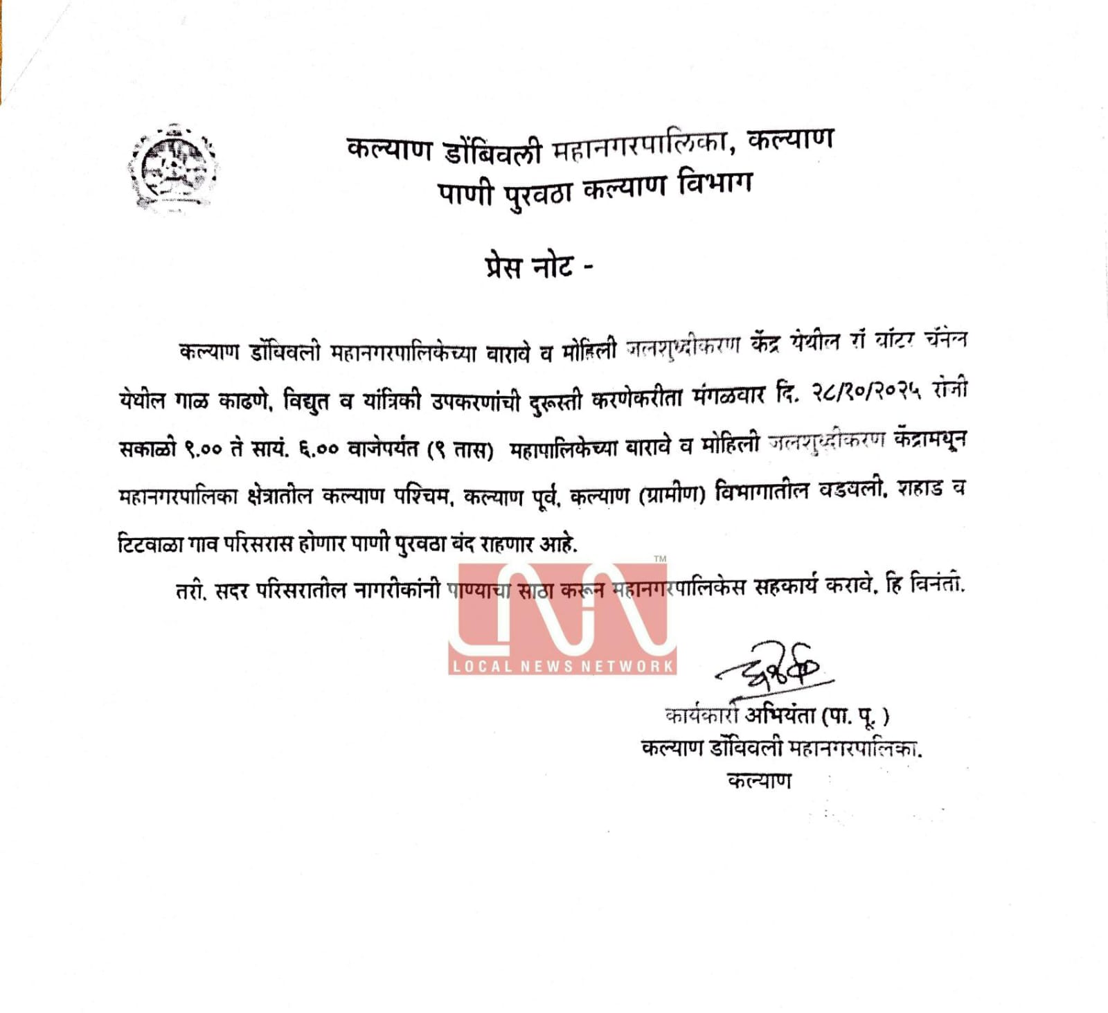 कल्याण डोंबिवली महानगरपालिकेच्या बारावी आणि मोहिनी जलशुद्धीकरण केंद्रामधून कल्याण पश्चिम कल्याण पूर्व कल्याण ग्रामीण विभागातील वडवली शहाड आणि टिटवाळा गाव परिसरात होणारा पाणीपुरवठा येत्या मंगळवारी सकाळी 9 ते सायंकाळी 6 वाजेपर्यंत बंद राहणार आहे. तरी या परिसरातील नागरिकांनी पाण्याचा आवश्यक तो साठा करून महानगरपालिकेला सहकार्य करावे असे आवाहन कल्याण डोंबिवली महानगरपालिकेच्या पाणीपुरवठा विभागातर्फे करण्यात आले आहे.